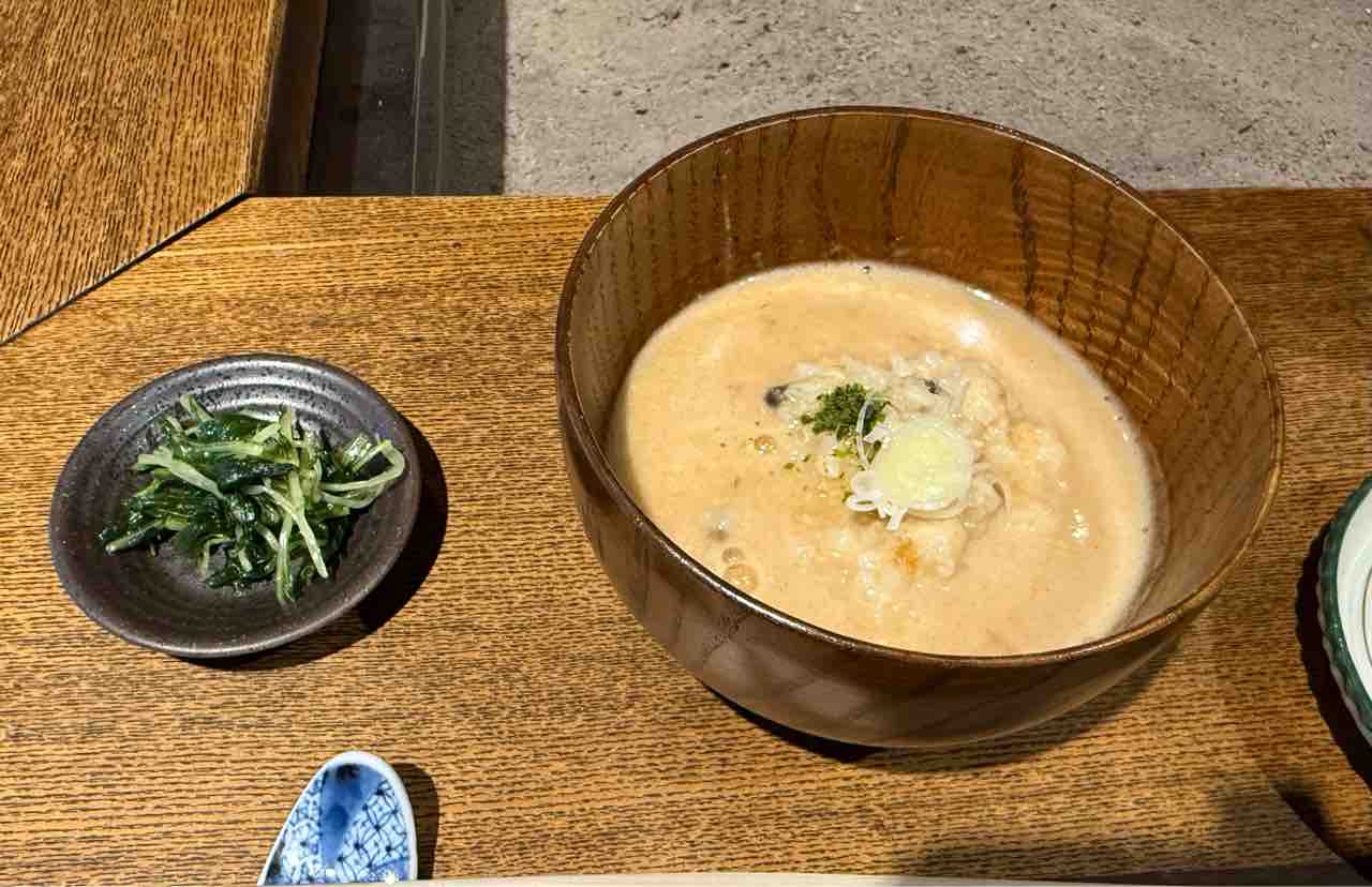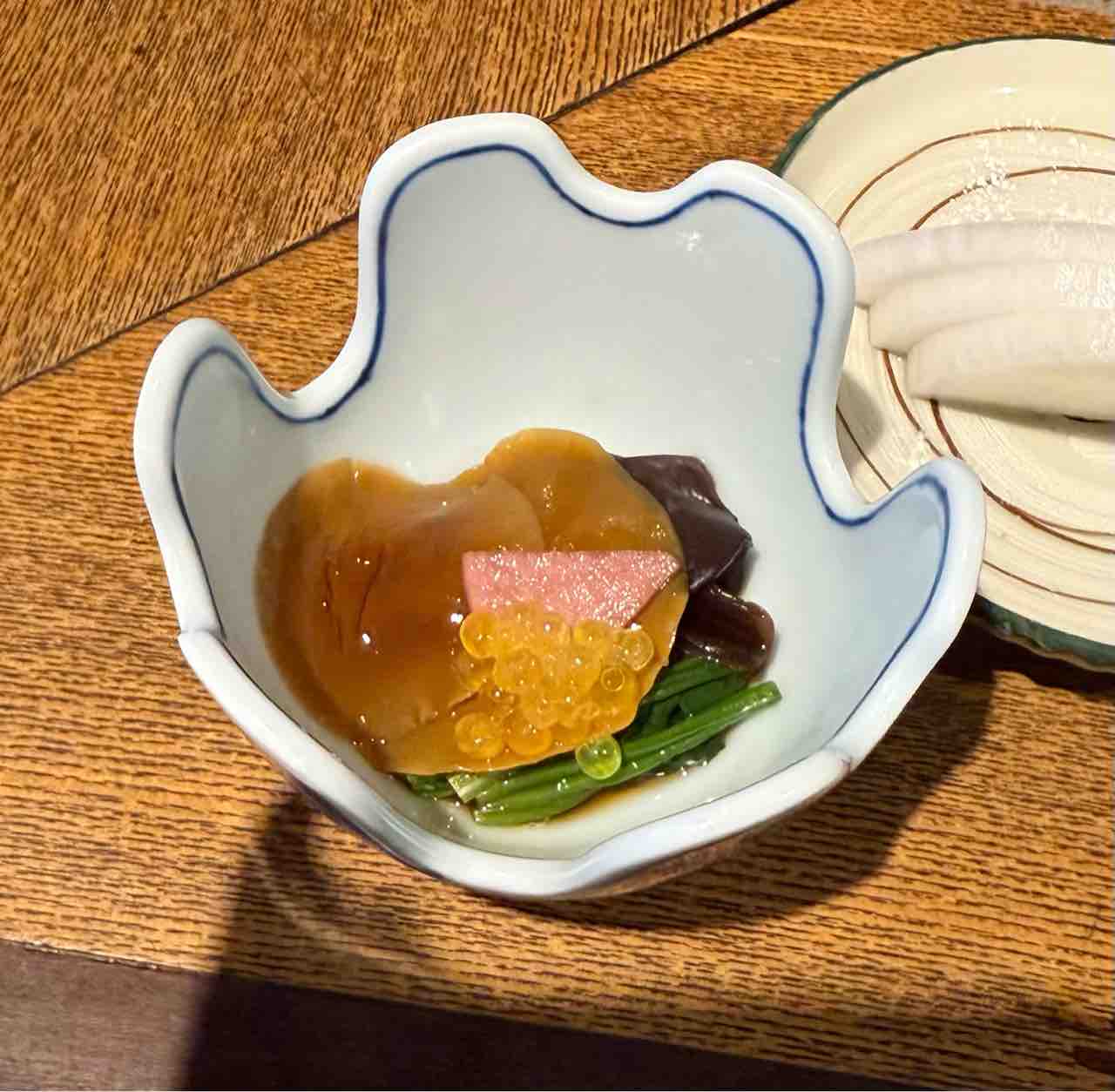 ほんだし汁があったまったら七草のすずなや大根など火の通りにくい野菜と枝豆天ぷらを入れる。