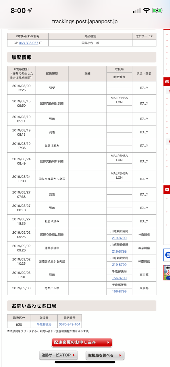 イタリアの追跡システムだと19日以降のステータスは記録されていませんでしたが、日本の追跡システムだと実際に荷物が到着するまでに何度かステータスが到着になっています。