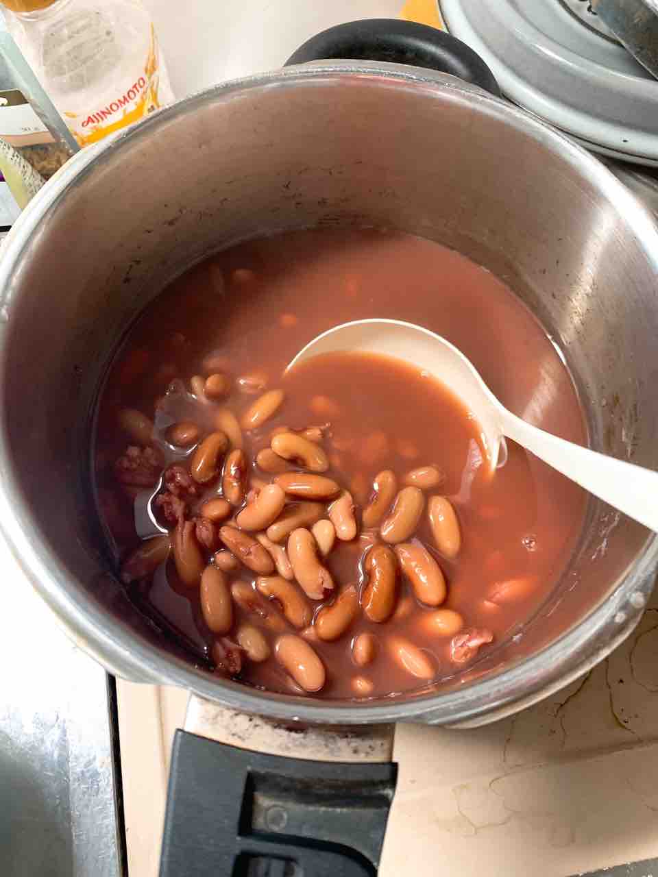 しばらく煮込んだら、煮汁は豆ひたひたになるくらいまで捨てます