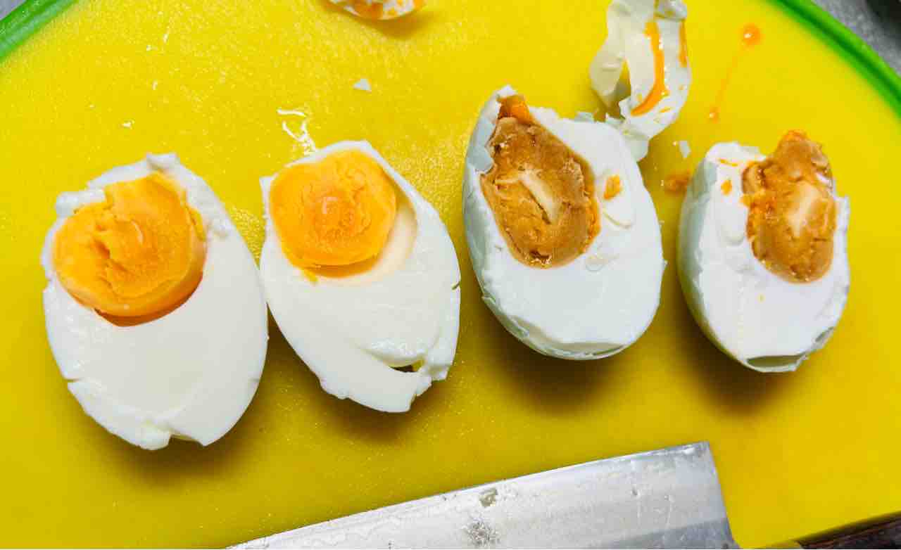 アヒルの方が塩気が強くて、黄身まで塩が染みています。殻が薄いからかな?