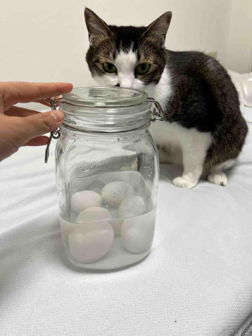 この写真は仕込み直後で卵が沈んでいるのですが、この後空気があるお尻の方がぷくっと浮いたまま1ヶ月過ごしました。