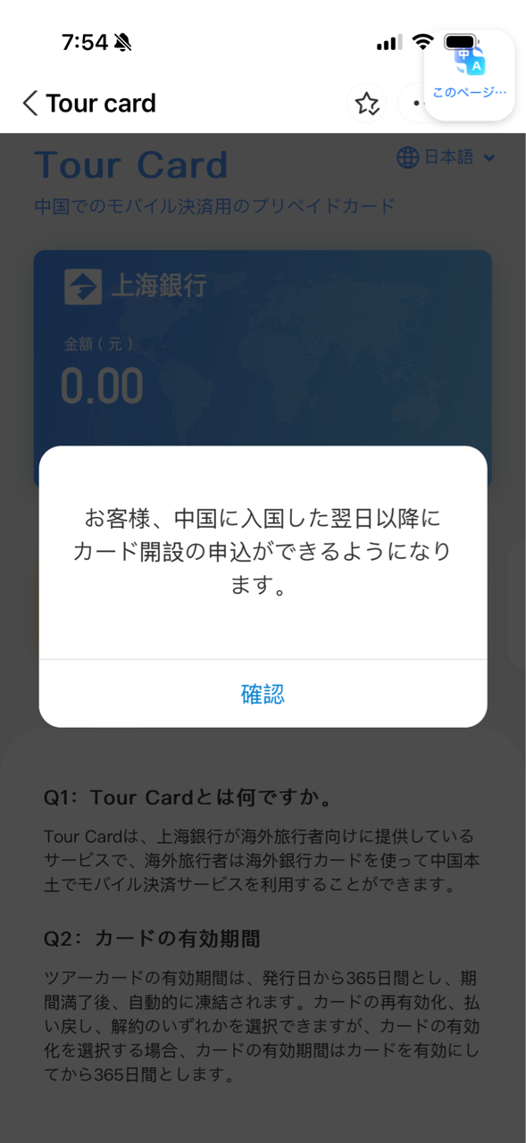 2024年10月24日時点でTourCardは中国入国翌日以降でないと使えません。