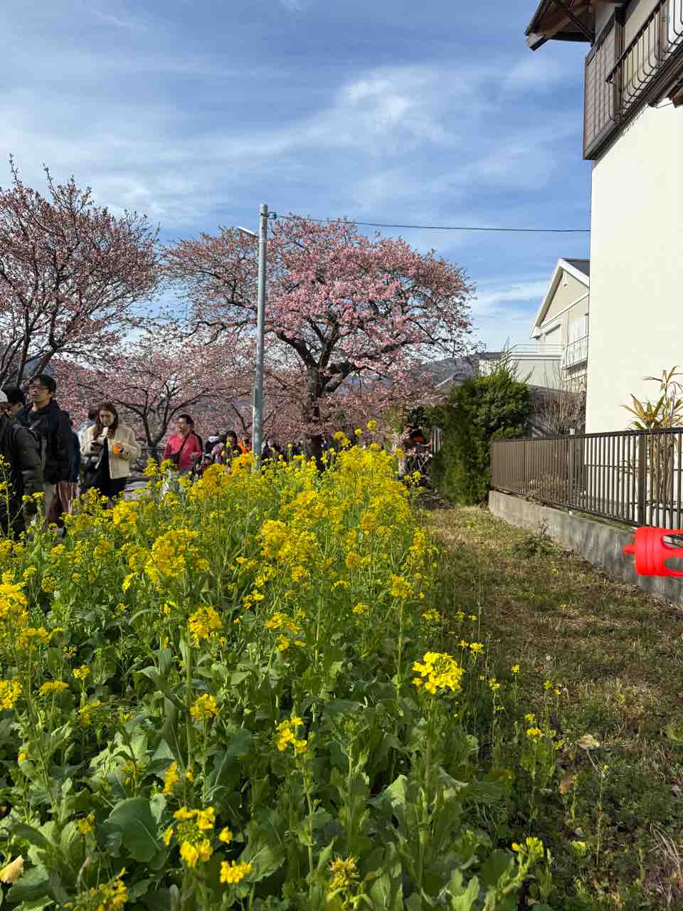 2026年02月22日 伊豆 河津桜を見る 河津桜を見に行ってきました。8分咲きくらい、土日だけど中目黒や上野公園ほどの人出はなく、出店もあっていい感じでした!菜の花とのコントラストが良いです。この桜、ここ10年以内くらいに切られることも決まってるみたいで、さらには新たに植えることもできないとかで、この桜並木も無くなってしまうとのことでした。一足早く今年の桜は堪能した気持ちです!