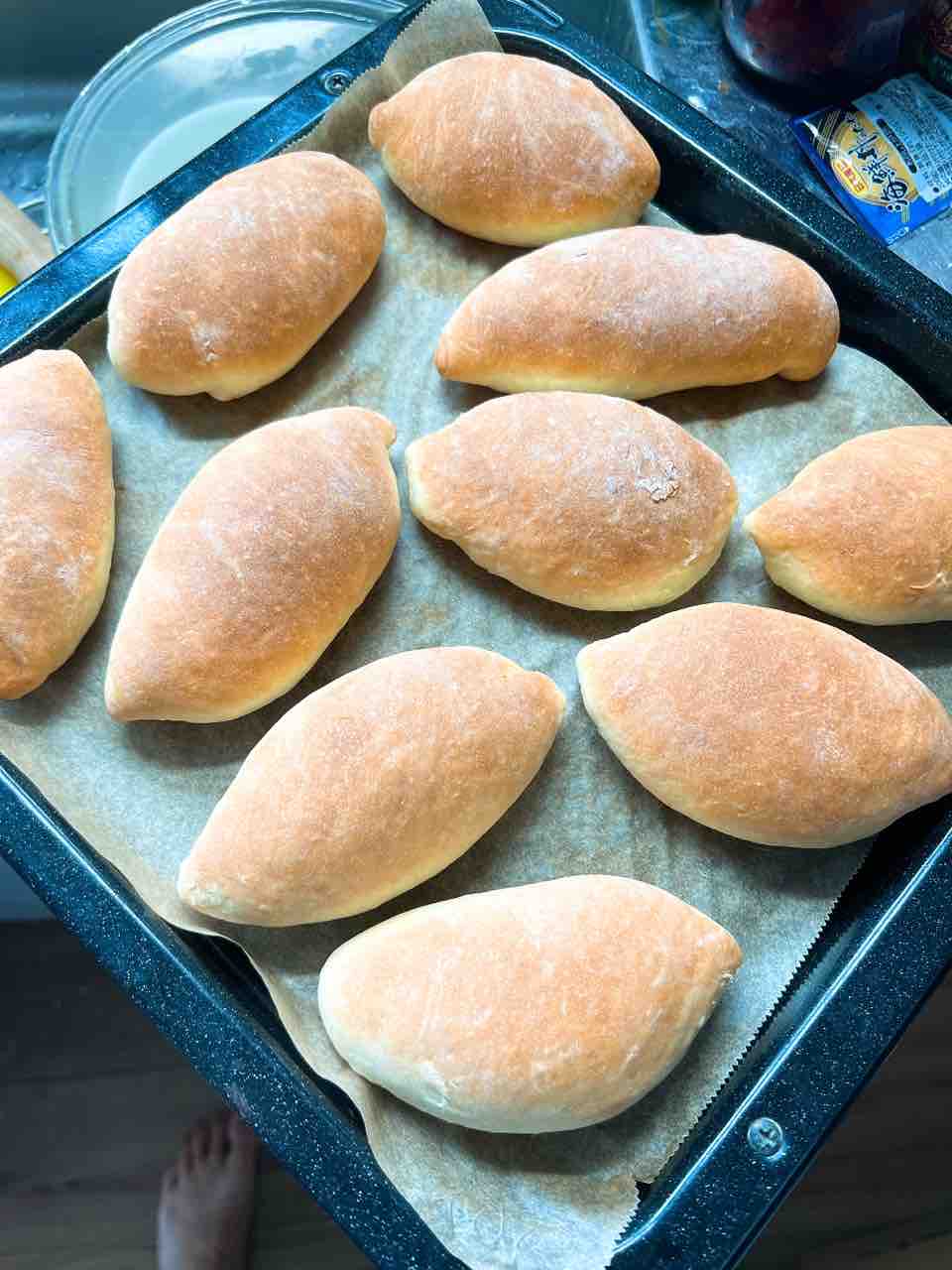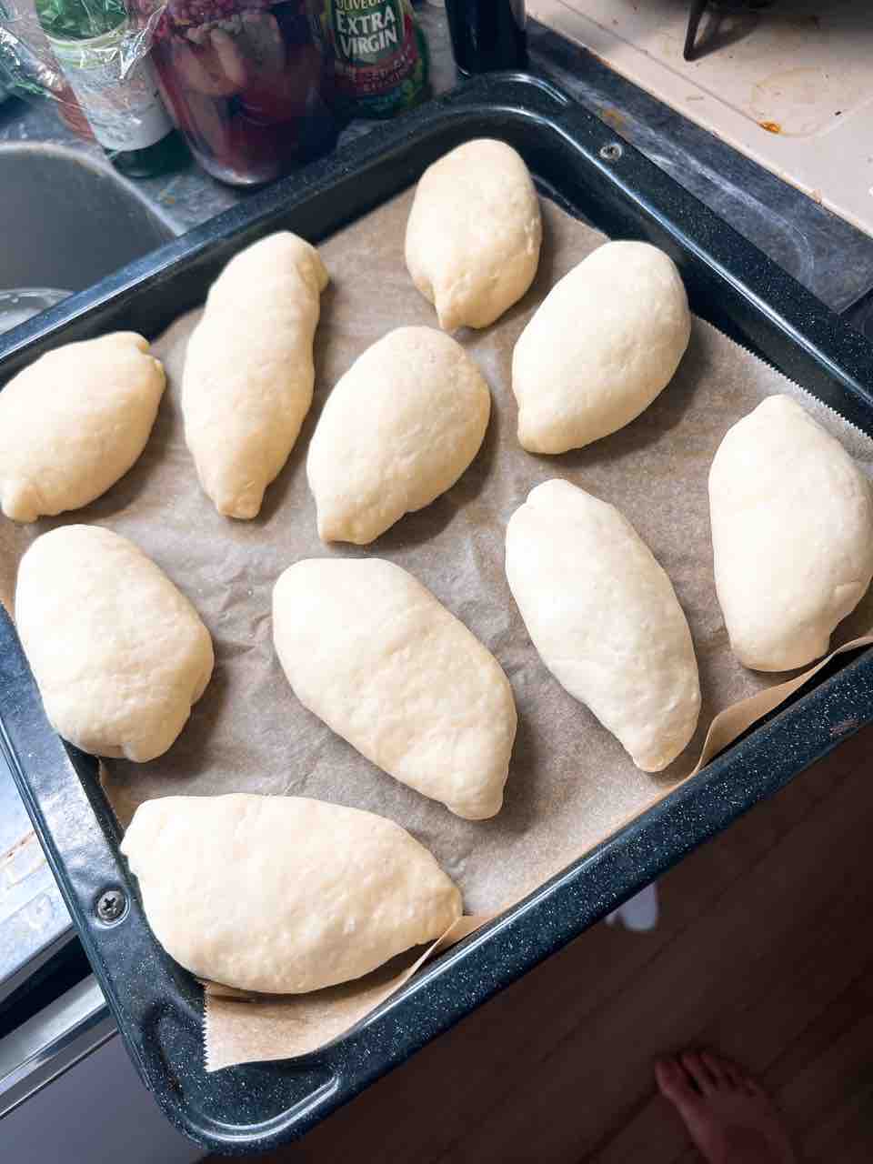 生地を伸ばすときも薄くなりすぎると、写真にある長細いやつみたいに不恰好になります。引き続き油物はお腹を壊すので、オーブンで焼きます。