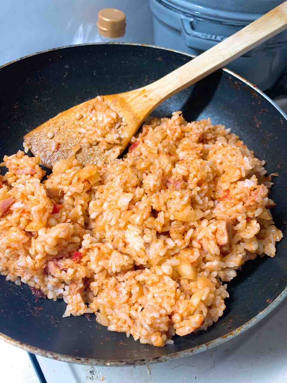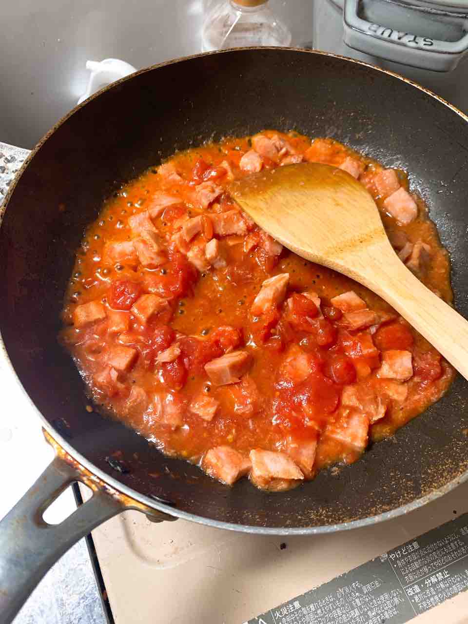 トマト缶をミキサーにかけ、フライパンに入れます。