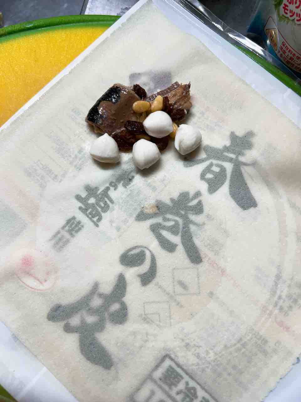 イワシひとかけ、チーズ4粒、松の実とレーズンを5粒ずつぐらい春巻きの皮に巻いていく。