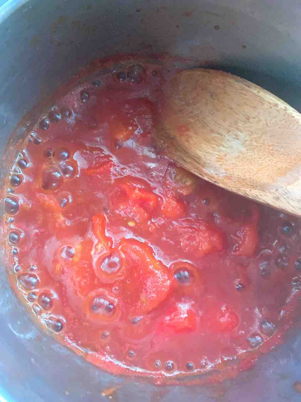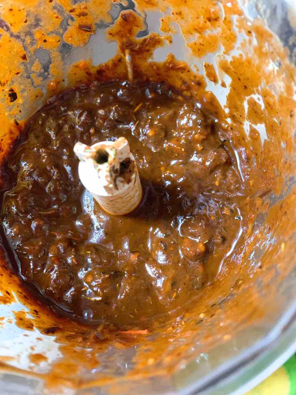 フードプロセッサーに、出汁をとった唐辛子、炒めたトマトとにんにくと玉ねぎとクミン、ビネガー、オレガノ、タイム、胡椒、シナモン、クローブ、生姜(つまりローリエと肉以外)全部入れて、全てがドロドロになるまで回す。