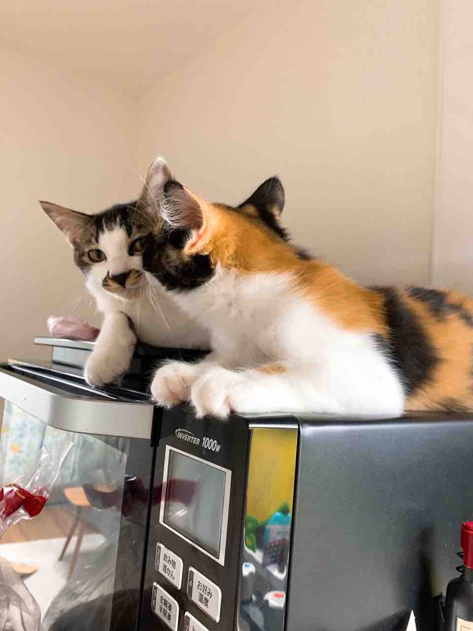 オーブンの上から猫たちが好奇心いっぱいで眺めています。