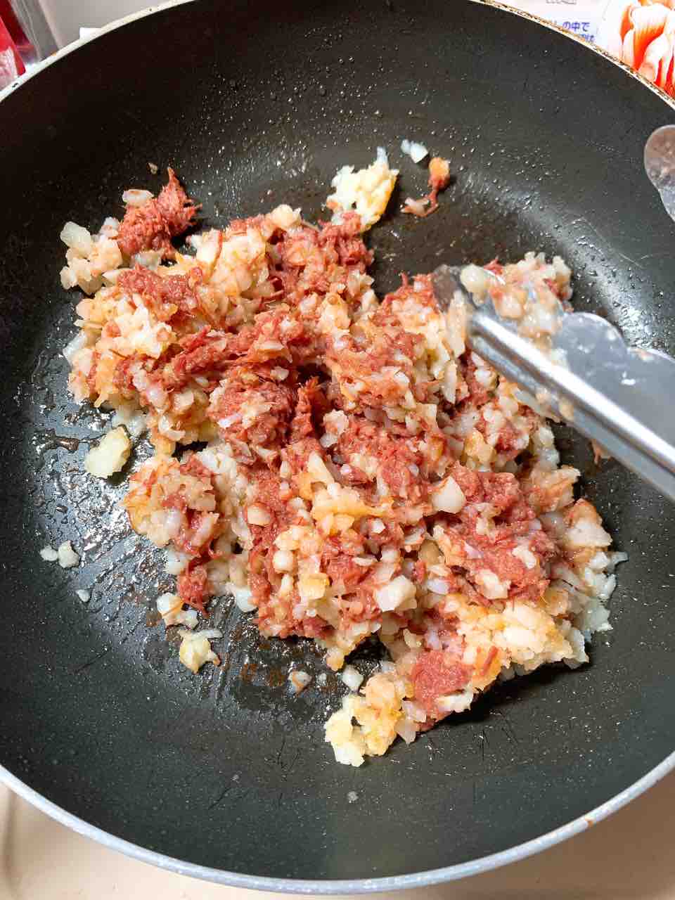 フライパンに多めに油を敷き、ハッシュドポテトをあっためる。